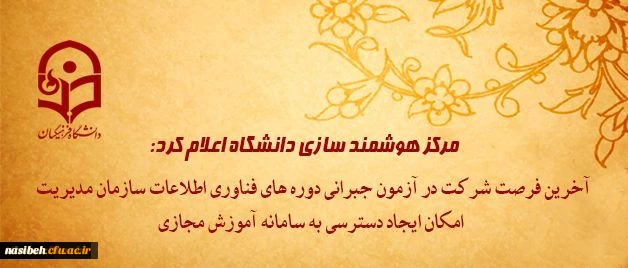 مرکز هوشمند سازی دانشگاه اعلام کرد: آخرین فرصت شرکت در آزمون جبرانی دوره های فناوری اطلاعات سازمان مدیریت و امکان ایجاد دسترسی به سامانه آموزش مجازی 2