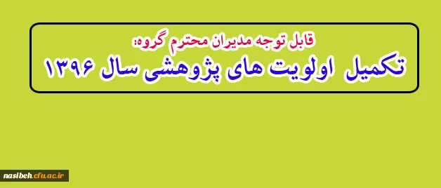 امتیاز دهید : قابل توجه مدیران محترم گروه: تکمیل اولویت های پژوهشی سال 1396 2 دوشنبه 21 فروردین 1396 ساعت 9:26