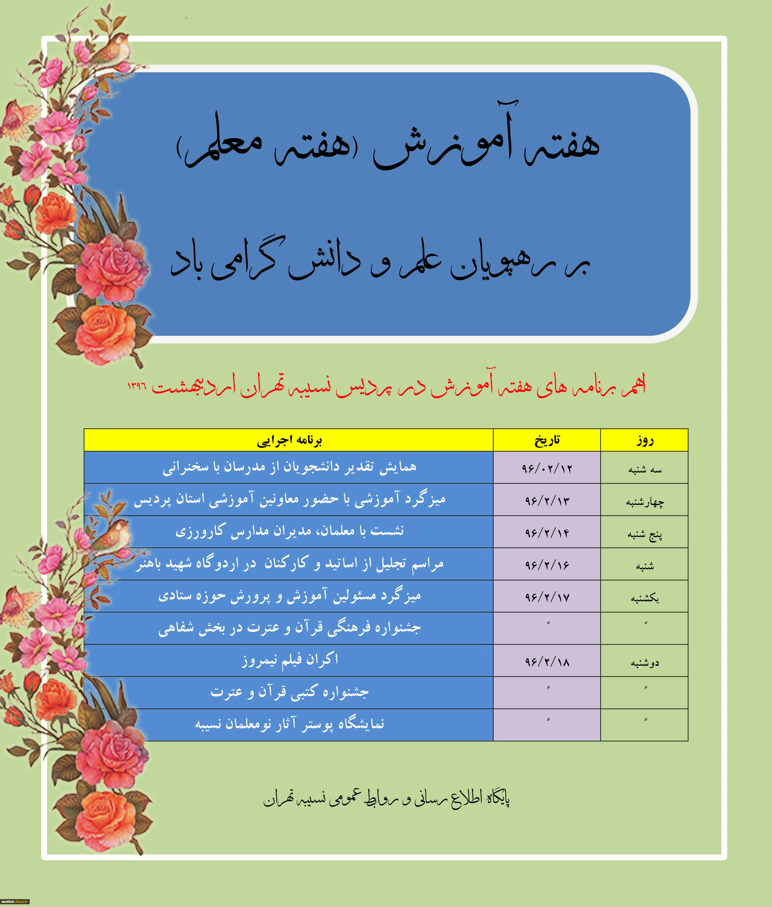 هفته آموزش (هفته معلم) بر رهپویان علم و دانش گرامی باد: اهم برنامه های هفته آموزش در پردیس نسیبه تهران اردیبهشت 1396 2