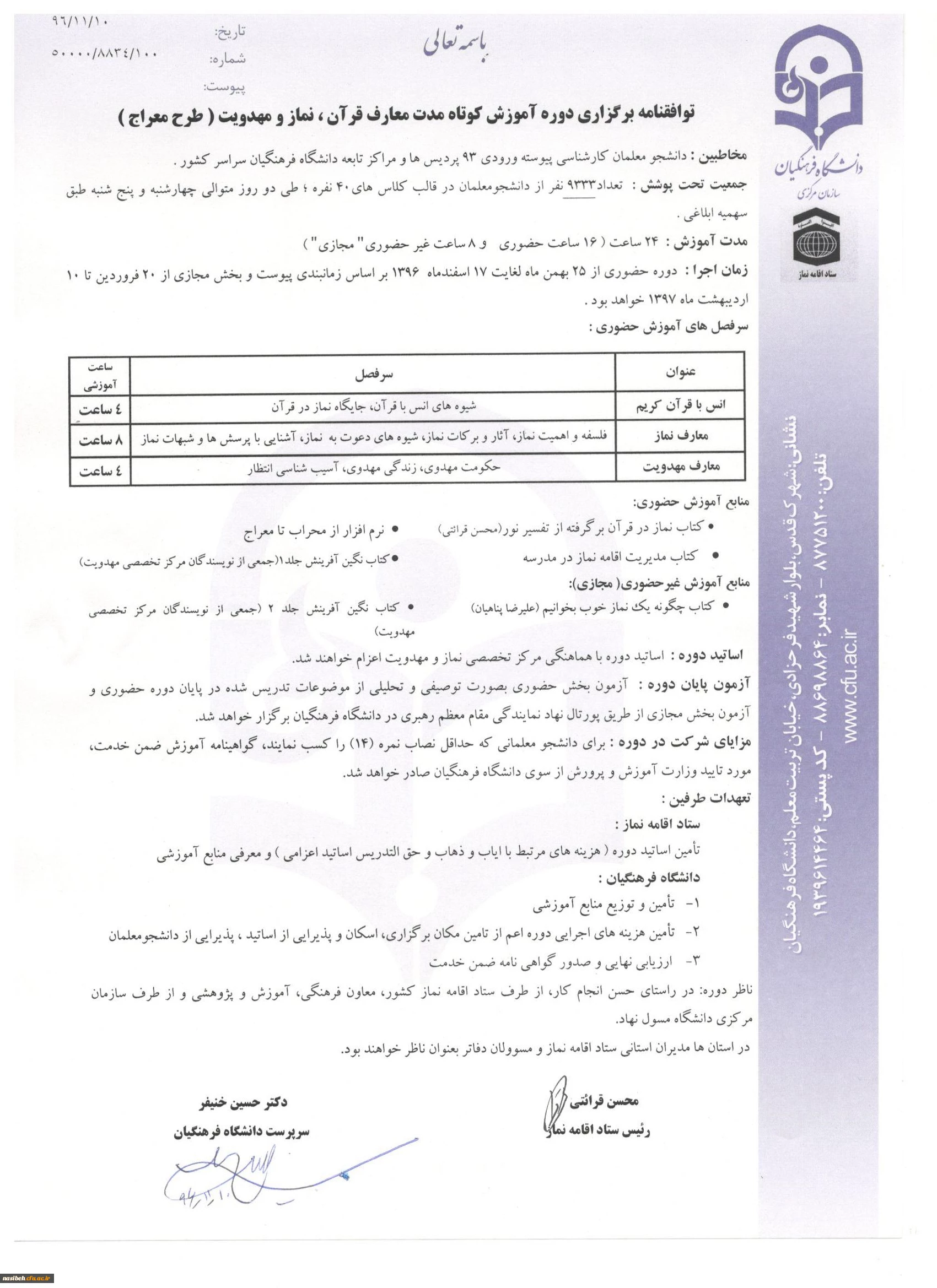 شیوه نامه برگزاری دوره آموزش معارف قرآن ، نمازومهدویت (طرح معراج) ویژه دانشجومعلمان 93 2