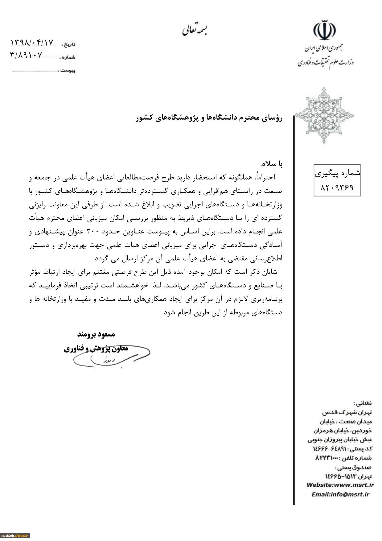 امتیاز دهید : درخواست میزبانی طرح فرصت مطالعاتی اعضای هیات علمی و جامعه صنعت 2 پنجشنبه 24 مرداد 1398 ساعت 12:37