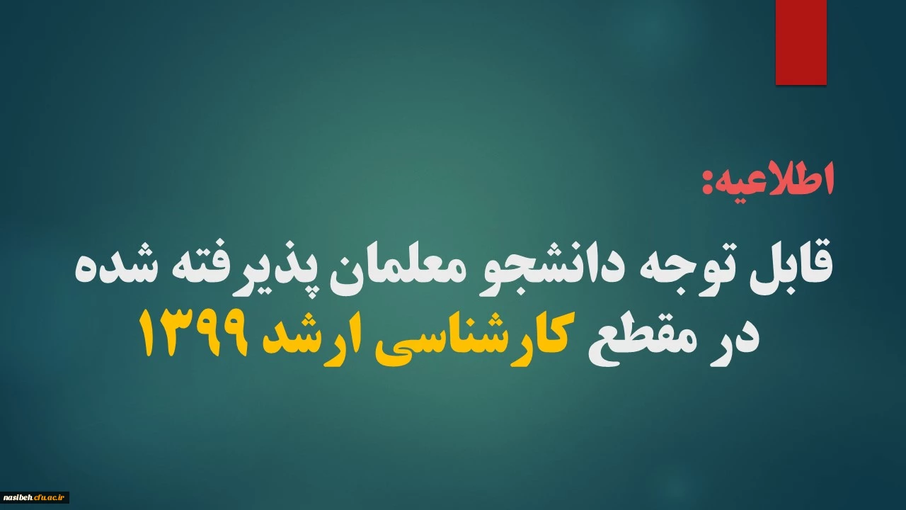 امتیاز دهید : قابل توجه دانشجو معلمان پذیرفته شده در مقطع کارشناسی ارشد 1399 پنجشنبه 8 آبان 1399 ساعت 19:15