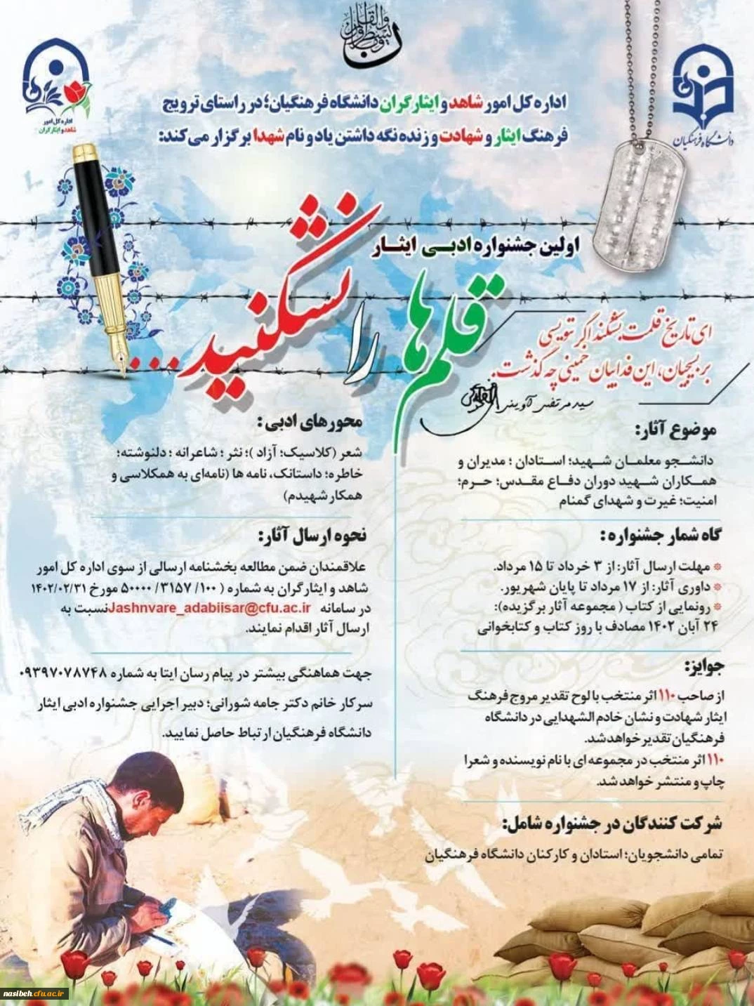 امتیاز دهید : اولین جشنواره ادبی ایثار ویژه استادان ، کارکنان و دانشجو معلمان دانشگاه فرهنگیان 2 چهارشنبه 10 خرداد 1402 ساعت 11:14