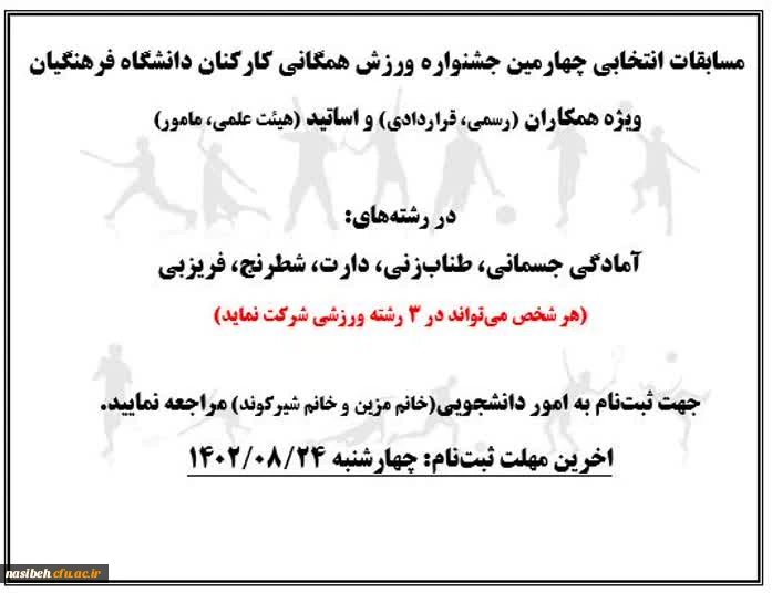 امتیاز دهید : مسابقات انتخابی چهارمین جشنواره ورزش همگانی کارکنان دانشگاه فرهنگیان 2 سهشنبه 23 آبان 1402 ساعت 10:12