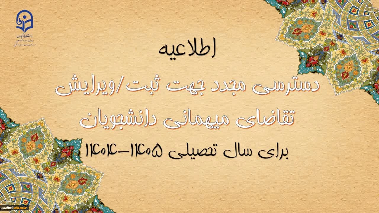 امتیاز دهید : دسترسی مجدد جهت ثبت میهمانی دانشجویان برای سال تحصیلی 1405-1404 2 سهشنبه 24 تیر 1404 ساعت 11:49
