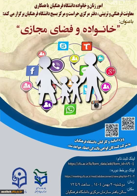 امور زنان و خانواده دانشگاه فرهنگیان با مشارکت معاونت فرهنگی و تربیتی، دفتر مرکزی حراست و مرکز بسیج دانشگاه فرهنگیان دوره بالندگی با عنوان : "خانواده و فضای مجازی" برای اساتید و کارکنان برگزار می کند. زمان: دوشنبه ۲۰ بهمن ۱۴۰۴ ساعت: ۹ الی ۱۲