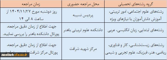 تأکید: لطفاً برای اطلاع از زمان دقیق مراجعه حضوری، به پورتال رسمی دانشکده علوم تربیتی باهنر، مرکز شهید شرافت، یا پردیس نسیبه (بسته به رشته تحصیلی خود) مراجعه نمایید.